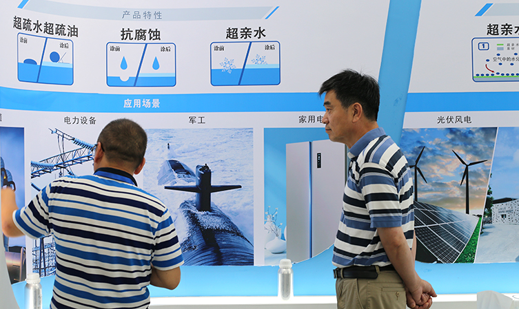 此次参观,蒋卫中先生向领导们展示了研发的纳米涂层各种产品性能:疏水疏油、亲水亲油、易清洁、抗指纹等,蒋卫中先生在涂了超疏水疏油纳米涂层的试验板上,倾倒水,迅速凝成水珠滑落,而食用油、蜂蜜也宛如凝固块状般“来去无痕”,以手试之,几乎未留下任何湿润或油腻。各位领导表示出极大的兴趣:以后再也不用担心油渍难清理的问题了!